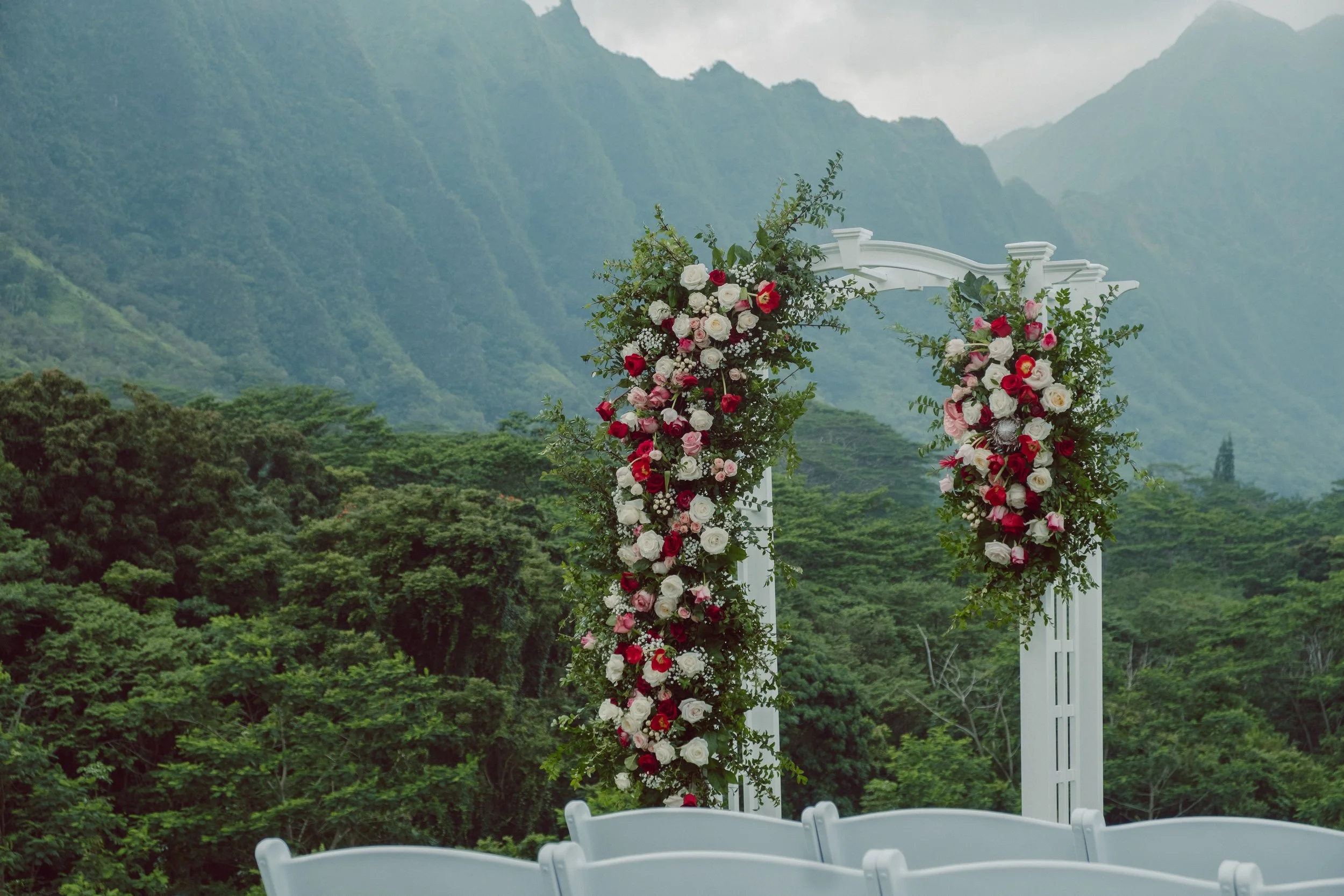 Fresh wedding ceremony Flower Arch at Koʻolau Ballrooms in Kaneohe, Oahu, with Koʻolau Mountains in the background